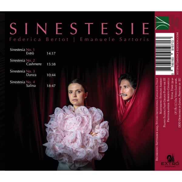Sinestesie présente ses morceaux comme un cycle en quatre volets — Extra, Cashmere, Danza, Salina — où la synesthésie n'est pas une simple métaphore, mais un principe structurant. Le son y devient matière sensible : il touche, éclaire, parfume, se dépose. Chaque pièce explore une qualité — excès, douceur textile, élan du mouvement, transparence minérale — guidant l'écoute vers une palette intérieure. L'ensemble forme une trajectoire unique, à la frontière entre perception et mémoire, où l'oreille est invitée à traduire la lumière en son, dans un paysage sonore continu.