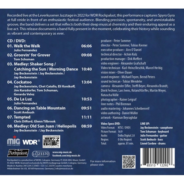 CD + DVD : Walk the Walk - Groovin' for Grover - Medley (Shaker Song / Catching the Sun / Morning Dance) - Cockatoo - De La Luz - Dancing on Table Mountain - Tempted - Medley: Old San Juan / Heliopolis
