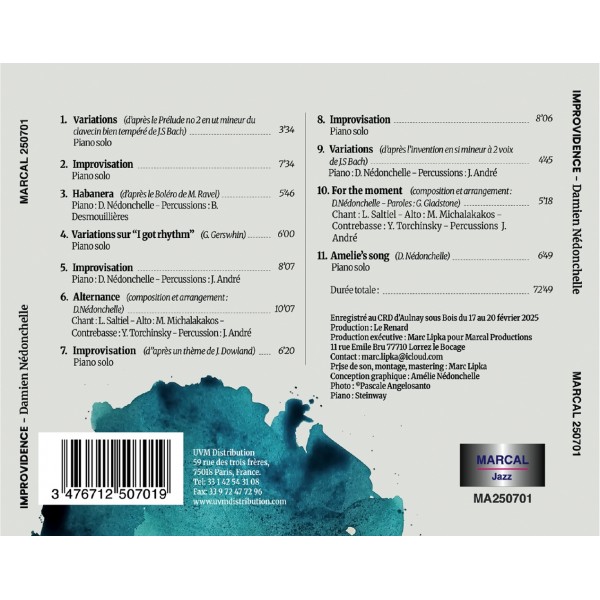 Variations (d'après le Prélude n°2 du clavecin bien tempéré de J.S Bach) - Improvisation - Habanera (d'apèrs le Boléro de M.Ravel) - Variations sur “I got rhythm” (G.Gerswhin) - Improvisation - Alternance (Composition et arrangement de D.Nédonchelle) - Improvisation (d'après un thème de J.Dowland) - Improvisation - Variations (d'après l'invention à 2 voix de J.S Bach) - For te Moment (composition et arrangement de D.Nédonchelle & Paroles : G.Gladstone) - Amelie's song (D.Nédonchelle)