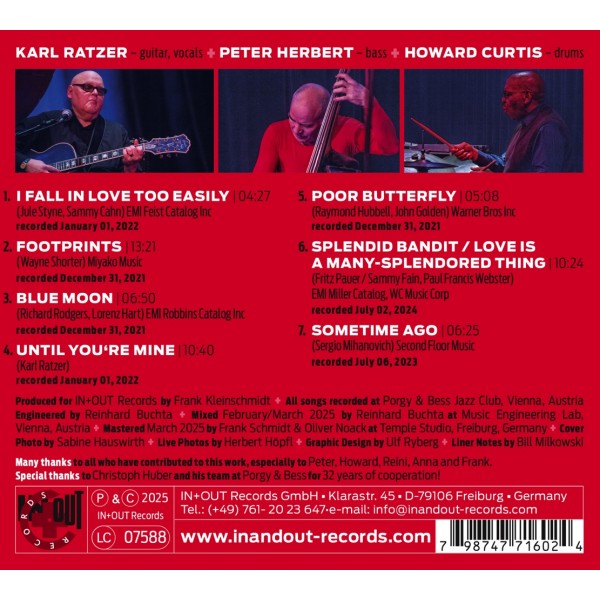 Le légendaire guitariste viennois Karl Ratzer s'associe au contrebassiste Peter Herbert et au batteur Howard Curtis pour son 36e album en tant que leader ou co-leader, disponible en CD et en double vinyle signé en édition limitée. Leur complicité, forgée au fil de nombreuses années de concerts au célèbre club de jazz viennois Porgy & Bess, trouve ici son expression la plus aboutie. Enregistré en live dans ce même club, Vienna Red capture toute la magie et la spontanéité de ce trio d'exception. Intime et raffiné, l'album met en lumière un Karl Ratzer en grande forme, entouré d'une rythmique complice et réactive. Ensemble, ils alternent entre swing enflammé, bossa novas envoûtantes et ballades poignantes sublimées par la voix émotive et sincère du guitariste.