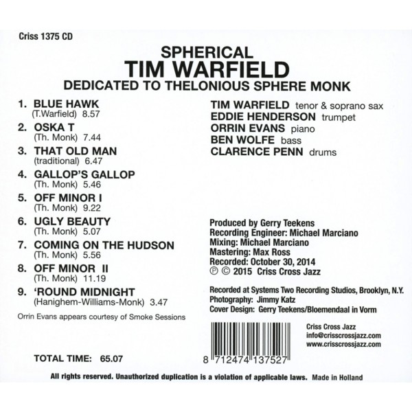 L'album de Tim Warfield en tant que leader, Spherical, fait référence au deuxième prénom de son sujet principal, l'immortel pianiste et compositeur de jazz Thelonious Sphere Monk. Il s'agit à ce jour du témoignage le plus personnel et le plus singulier du saxophoniste ténor et soprano. Plus précisément, Warfield, entouré d'un quintette virtuose et inspiré — Eddie Henderson (trompette), Orrin Evans (piano), Ben Wolfe (contrebasse) et Clarence Penn (batterie) — propose une relecture très personnelle de six compositions de Monk (Off Minor, Ugly Beauty, Oska T, Gallop's Gallop, Coming on the Hudson et 'Round Midnight), ainsi que de That Old Man (enregistré par Monk sous le titre Children's Song en 1964). L'album comprend également un blues original de Warfield, dédié au premier employeur de Monk, le saxophoniste Coleman Hawkins.