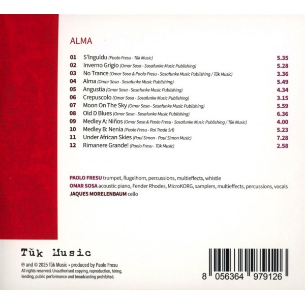 Le pianiste cubain Omar Sosa et le trompettiste italien Paolo Fresu, issus de cultures différentes, partagent une vision musicale étonnamment proche. Avec l'album « Alma » (« Âme »), ils poursuivent un même objectif artistique où virtuosité, poésie et spiritualité se rencontrent. Enregistré à Udine en mai 2011, l'album s'enrichit de la participation du violoncelliste Jaques Morelenbaum, apportant une nouvelle profondeur sonore. À travers douze pièces instrumentales envoûtantes, Sosa et Fresu signent une œuvre harmonieuse, apaisante et intensément vivante, empreinte d'amour et d'âme.
