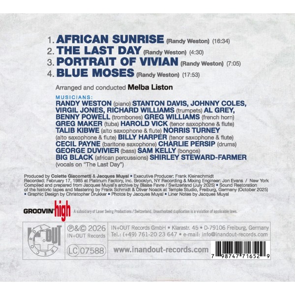 Randy Weston, piano / Melba Liston, direction / African Rythm Orchestra : Stanton Davis, trompette / Johnny Coles, trompette / Virgil Jones, trompette / Richard Williams, trompette / Al Grey, trombone / Benny Powell, trombone / Greg Williams, cor / Greg Maker, tuba / Harold Vick, sax ténor et flûte / Talib Kibwe, sax alto et flûte / Norris Turney, sax alto et flûte / Billy Harper, sax ténor et flûte / Cecil Payne, sax baryton / Charlie Persip, batterie / George Duvivier, contrebasse / Sam Kelly, bongos / Big Black, percussions africaines / Shirley Steward-Farmer, chant