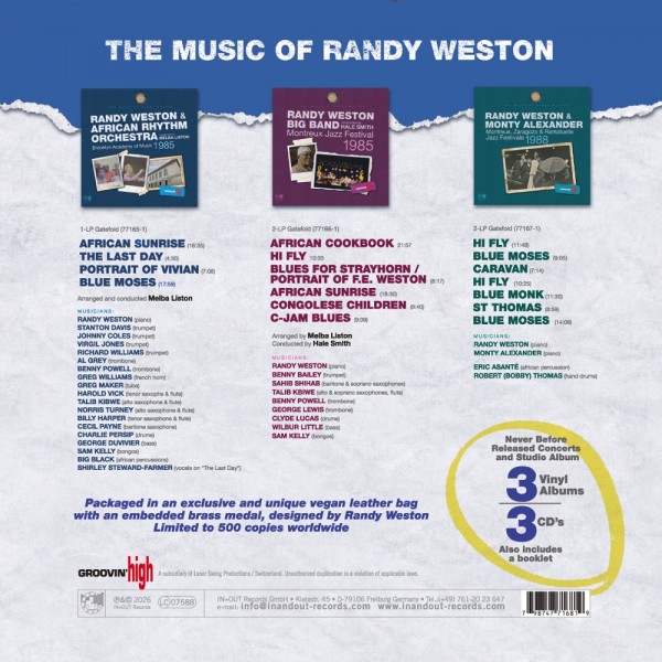 Coffret anniversaire de 3 albums avec un sac en cuir végétal et une médaille en laiton intégrée, designée par Randy Weston, incluant : Brooklyn Acadamy Of Music, 1985 - Randy Weston & African Rhythm Orchestra / Montreux Jazz Festival, 1985 - Randy Weston Big Band / Festivals de Jazz de Montreux, Zaragoza et Ramatuelle, 1988 - Randy Weston & Monty Alexander