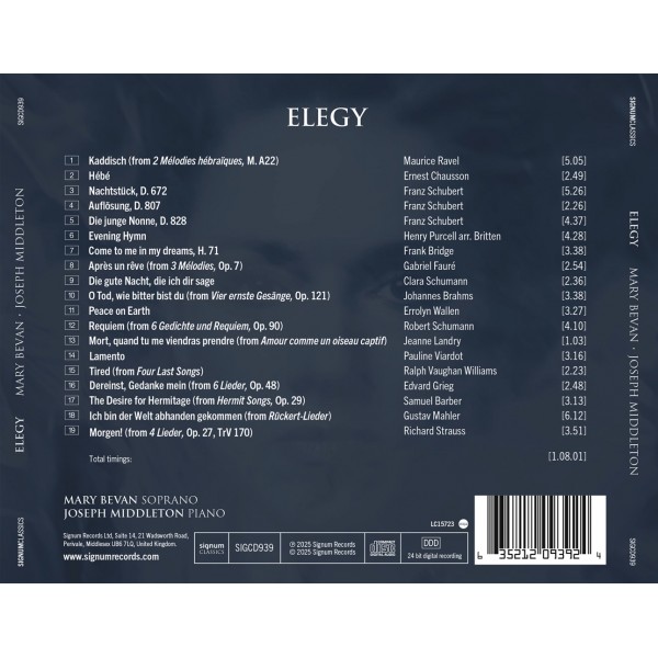 Le nouvel album Elegy de Mary Bevan et Joseph Middleton est né de leur programme de récital From Earth to Heaven, conçu dans une période de profonde perte personnelle. Marqué par l'expérience de Mary Bevan, endeuillée par la disparition de son père, ce récital explore le mystère de la mort et le réconfort que la musique peut offrir. À travers des œuvres de Schubert, Fauré, Mahler, Jeanne Landry, Errollyn Wallen, Pauline Viardot, entre autres, Elegy propose un voyage poignant entre deuil et transcendance.