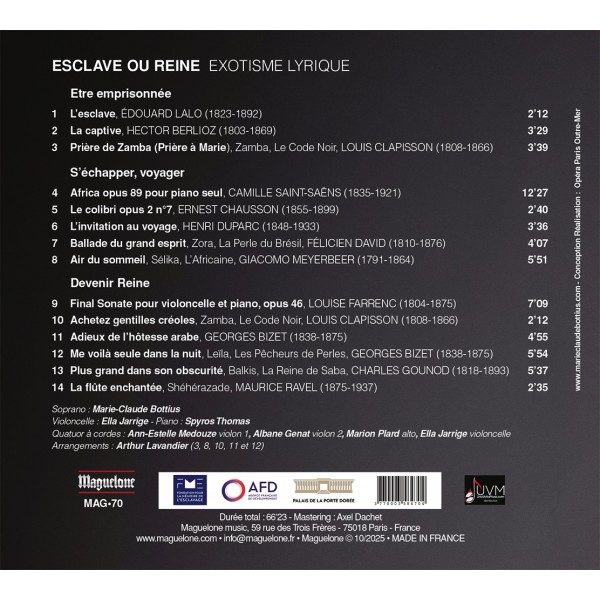 La soprano Marie-Claude Bottius présente son nouvel album Esclave ou Reine – Exotisme Lyrique, un voyage musical au cœur du XIXᵉ siècle français, à la croisée de l'histoire, de la mémoire et de la poésie. Ce disque réunit airs d'opéras et mélodies signés Lalo, Berlioz, Clapisson, Saint-Saëns, Chausson, Duparc, David, Meyerbeer, Farrenc, Bizet, Gounod et Ravel, dans une exploration sensible de l'exotisme et des figures féminines issues d'ailleurs. Au centre de ce programme se trouve l'inédit « Prière de Zamba » tiré de Zamba, Le Code Noir de Louis Clapisson, un air poignant jamais enregistré jusqu'à présent, symbole du combat pour la liberté et la dignité. À travers ce répertoire rare, Marie-Claude Bottius redonne voix aux héroïnes oubliées de l'opéra français — femmes esclaves, reines ou aventurières — incarnant à la fois la fragilité et la force. Elle est accompagnée de Spyros Thomas (piano), Ella Jarrige (violoncelle), et du Quatuor à cordes Ann-Estelle Medouze, Albane Genat, Marion Plard et Ella Jarrige.