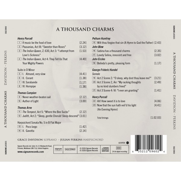 A Thousand Charms invite l'auditeur à parcourir deux siècles de chant anglais, des ayres intimistes de Campion aux chefs-d'œuvre théâtraux de Purcell, jusqu'aux arias profondément expressives de Handel. Le programme retrace l'évolution du chant soliste, depuis la simplicité inspirée du luth jusqu'à un drame richement ornementé, où la poésie se mêle à une musique d'une clarté et d'une profondeur remarquables. La voix pure et agile de Grace Davidson, soutenue par l'accompagnement sensible du clavecin de Julian Perkins, apporte fraîcheur et immédiateté à ce répertoire, mettant en lumière son raffinement, son inventivité et son humanité. Pour tous ceux que séduit la beauté de la musique ancienne, cet enregistrement propose un voyage captivant à travers quelques-unes de ses œuvres les plus intemporelles.