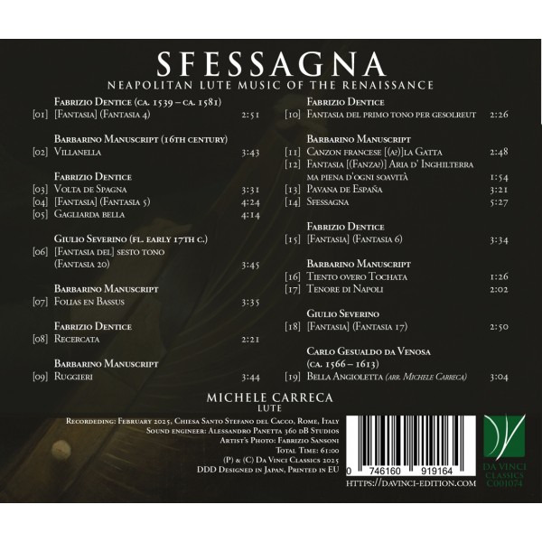 Le répertoire de la Renaissance et du XVIIᵉ siècle pour luth offre un témoignage unique de la pratique musicale, de la transmission écrite et du contexte culturel de l'Europe moderne. Symbole de l'élégance et de l'invention musicale, le luth se déploie dans les sphères savantes comme populaires, mêlant textures contrapuntiques, danses et intabulations vocales sacrées ou profanes. Michele Carreca invite l'auditeur à un voyage captivant à travers les œuvres de Fabrizio Dentice, Giulio Severino, Gesualdo da Venosa et d'anonymes dont les chefs-d'œuvre font encore résonner la mémoire de l'instrument.
