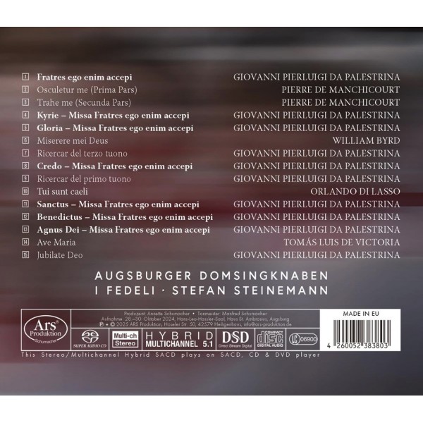 Giovanni Pierluigi Palestrina (1525-1594) : Missa Fratres ego enim accepi, Fratres ego enim accepi, Ricercare del tetrzo tuono, Ricercare del primo tuono, Jubilate Deo - Pierre de Manchicourt (1510-1564) : Osculetur me, Trahe me - William Byrd (1540-1623) : Miserere mei Deus - Roland de Lassus (1532-1594) : Tui sunt caeli - Tomas Luis de Victoria (1548-1611) : Ave Maria