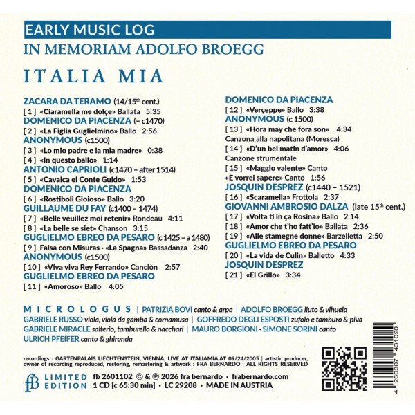 Italia Mia, par l'Ensemble Micrologus, n'est pas une simple collection de pièces, mais un véritable voyage musical invitant l'auditeur à explorer la richesse et la diversité des paysages sonores de l'Italie d'autrefois. Grâce à une interprétation profondément engagée, Micrologus ouvre une fenêtre sur le passé, permettant au public contemporain de découvrir toute la beauté et la complexité de la musique italienne ancienne. Cet enregistrement live témoigne de l'attrait intemporel de ces œuvres ainsi que de l'engagement de l'ensemble à préserver et célébrer la richesse du patrimoine musical italien.