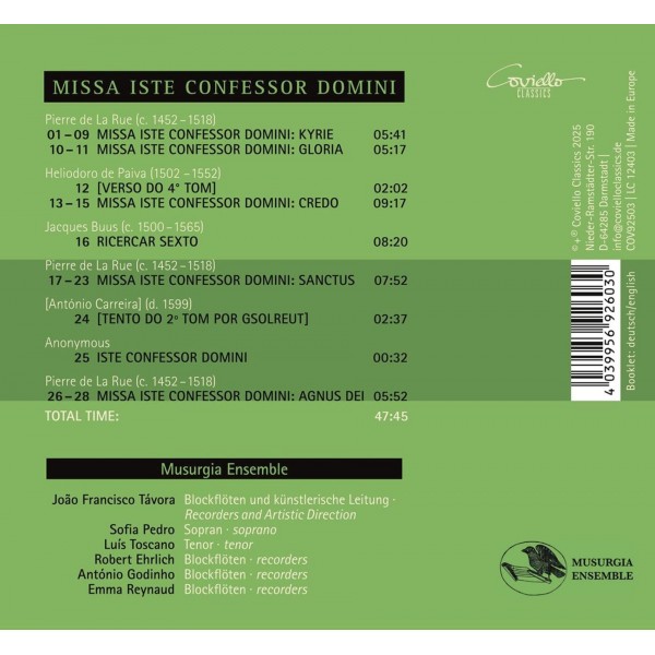 Missa Iste Confessor Domini – Musique portugaise et franco-flamande du XVIᵉ siècle. Avec Missa Iste Confessor Domini, l'Ensemble Musurgia propose un voyage fascinant au cœur de la musique du XVIᵉ siècle, directement inspiré des manuscrits historiques du monastère de Santa Cruz à Coimbra, au Portugal. L'enregistrement met en lumière la messe éponyme, issue du livre de chœur P-Cug MM 2, l'une des sources musicales portugaises les plus importantes de cette époque.