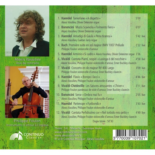 Georg Friedrich Haendel (1685-1759) : Tamerlano « A dispetto », Amadigi di Gaula « Pena tiranna », Arminio « Si cadrò », Flavio « Rompo i lacci », Partenope « Furibondo » - Giovanni Bononcini (1670-1747) : Muzio Scevola « Tormento fiero », Serse « Ombra mai fu » - Johann Sebastian Bach (1685-1750) : Première suite en sol majeur BWV 1007 - Prélude - Antonio Vivaldi (1678-1741) : Cantata Pianti, sospiri « Lusinga è del nocchier », Concerto en do majeur RV 400 - Largo, Cantata Perfidissimo cor « Nel torbido mio petto » - Antonio Vivaldi / Nicolas Chédeville (1705-1782) : Les Saisons amusantes : « L'hiver »