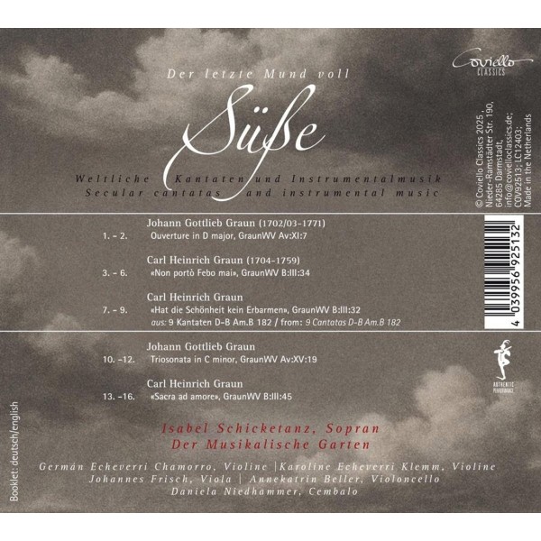 Le nouvel album de Der Musikalische Garten présente pas moins de quatre premières mondiales et offre une nouvelle plongée captivante dans la richesse expressive du XVIIIᵉ siècle. Au cœur du programme figurent trois cantates profanes de Carl Heinrich Graun, ainsi que l'enregistrement mondial inédit d'une ouverture méconnue de son frère Johann Gottlieb Graun.