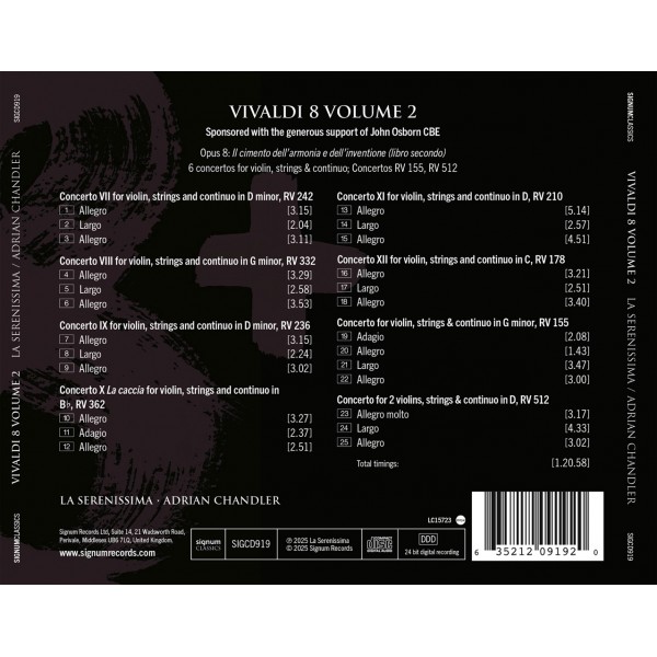 Les géants du baroque La Serenissima reviennent avec VIVALDI 8 – VOLUME 2, faisant suite au premier volume paru en février 2025. Réputée pour « déchaîner les éléments avec Vivaldi », La Serenissima est « l'un des orchestres de chambre les plus appréciés de Grande-Bretagne » (The Telegraph), reconnue pour ses performances remarquables et pour mettre en lumière de nombreux compositeurs italiens du baroque restés méconnus. Fait unique : l'intégralité du répertoire de l'ensemble est éditée à partir des sources originales par son fondateur et violoniste, Adrian Chandler.