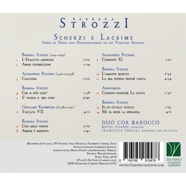 La Venise du XVIIᵉ siècle s'illumine grâce à Barbara Strozzi, compositrice, chanteuse et poétesse extraordinaire, enfin redécouverte. L'album « Scherzi e Lacrime » dresse son portrait à travers des airs et cantates profanes – les formes qu'elle affectionnait le plus – révélant un trésor de passion, d'introspection et de virtuosité expressive, porté par le Duo Cor Barocco avec la soprano Micol Pisanu et la luthiste Francesca Torelli. Les cantates de Strozzi donnent voix aux nuances les plus subtiles de l'âme, dépeignant l'amour sous toutes ses formes, des lamentations émouvantes aux espiègles joutes amoureuses, à travers des mélodies qui allient beauté et raffinement de l'art baroque.