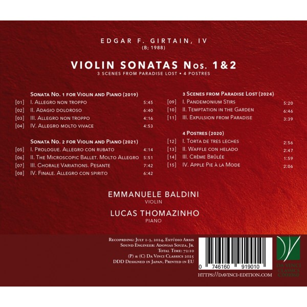 Egar F. Girtain IV (1988-*) : Sonate n°1 pour violon et piano, Sonate n°2 pour violon et piano, 3 Scenes from Paradise Lost, 4 Postres