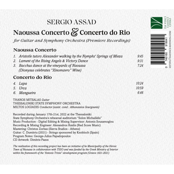 Cet album Da Vinci Classics présente deux concertos pour guitare et orchestre symphonique de Sergio Assad, enregistrés ici en première mondiale : Naoussa Concerto et Concerto do Rio. Le guitariste Thanos Mitsalas y est accompagné par l'Orchestre Symphonique d'État de Thessalonique sous la direction de Miltos Logiadis. Ces œuvres contrastent deux univers culturels : un Brésil urbain et une Grèce rurale. Le Naoussa Concerto a été créé dans la ville grecque éponyme, en hommage aux 200 ans du massacre de 1822 pendant la guerre d'indépendance. Guitariste, compositeur et arrangeur brésilien de renom, Sergio Assad est une figure majeure du répertoire contemporain, formé par Monina Tavora et l'Université de Rio de Janeiro.