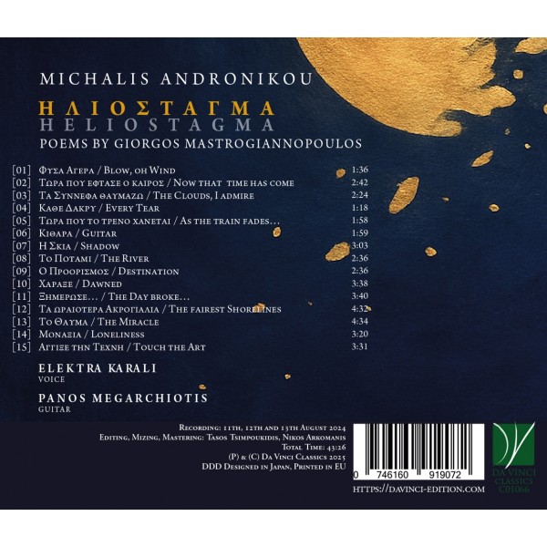 Michalis Andronikou : Heliostagma, cycle de 15 mélodies pour voix et guitare sur des poèmes de Giorgos Mastrogiannopoulos
