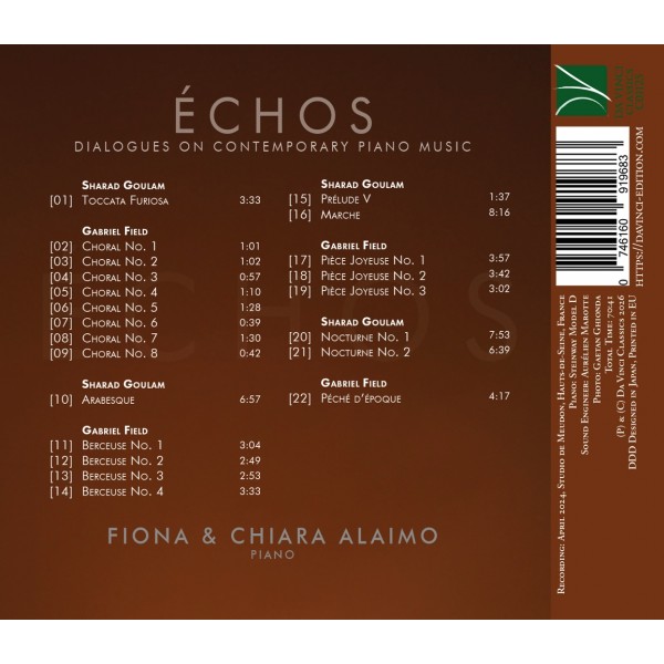 Il était sans doute inévitable que les musiques de Gabriel Field et Sharad Goulam convergent un jour vers un même album. Leur amitié est ancienne, ils ont souvent partagé la scène, mais ce qui importe ici n'est pas la biographie, c'est l'affinité : un engagement commun pour la tonalité et la modalité, pour une harmonie coloriste et, surtout, à la pointe expressive de la dissonance. Échos met ces affinités à l'épreuve de la différence, et façonne un programme où deux idiomes personnels se reflètent et s'éclairent sans jamais se confondre. Il en résulte une suite qui demande à être entendue comme un dialogue de tempéraments, un enchaînement d'échos où le geste rencontre la rêverie et où la substance frôle l'ombre.