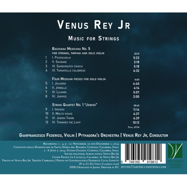 Venus Rey Jr (1969-*) : Bachiana Mexicana n°5 pour cordes, timpani et violon solo, Quatre pièces mexicaines pour violon seul, Quatuor à cordes n°1 “Jewish”