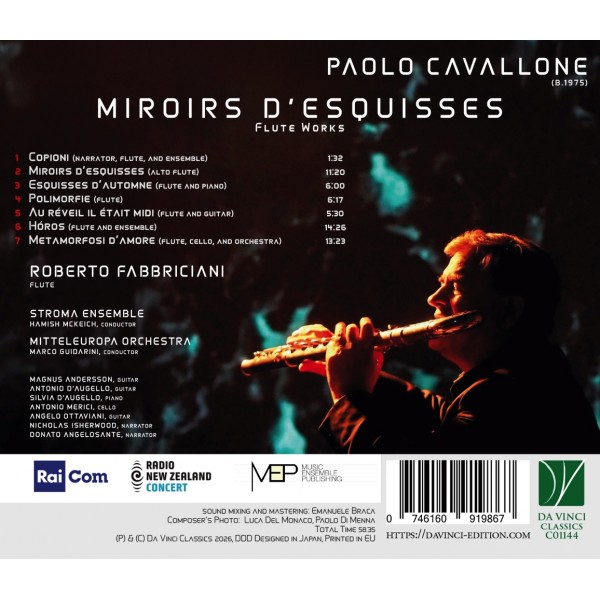 Roberto Fabbriciani, flûte / Stroma Ensemble / Hamish Mckeich, direction / Mitteleuropa Orchestra / Marco Guidarini, direction / Magnus Andersson, guitare / Antonio D'Augello, guitare / Silvia D'Augello, piano / Antonio Merici, violoncelle / Angelo Ottaviani, guitare / Nicholas Isherwood, narrateur / Donato Angelosante, narrateur