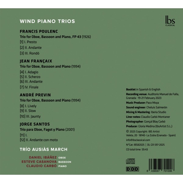 Francis Poulenc (1899-1963) : Trio pour hautbois, basson et piano FP 43 - Jean Françaix (1912-1997) : Trio pour hautbois, basson et piano - André Previn (1929-2019) : Trio pour hautbois, basson et piano - Jorge Santos (1973-*) : Trio pour hautbois, basson et piano