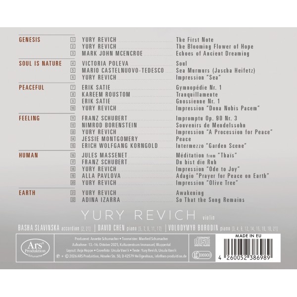 Avec son album concept PEACE, le célèbre violoniste et compositeur autrichien Yury Revich (*1991) invite les auditeurs à un voyage à travers le monde, explorant la paix intérieure et universelle à travers les voix de compositeurs issus de cultures et horizons variés. Le programme, résolument mélodieux, inclut également des compositions de Yury Revich lui-même : ses Impressions – de courtes pièces musicales conçues spécialement pour ce projet – ainsi que deux poèmes originaux, qui servent de ponts conceptuels entre les chapitres de l'album et donnent à PEACE une narration musicale cohérente. Interprété avec sensibilité par Yury Revich, aux côtés de l'accordéoniste Basha Slavinska et des pianistes David Chen et Volodymyr Borodin, l'album révèle une profondeur artistique et une cohérence particulières.