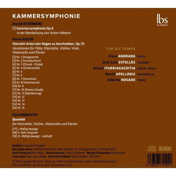 Arnold Schoenberg (1874-1951) : Kammersymphonie (Symphonie de Chambre) n°1 Op.9 - Hanns Eisler (1898-1962) : Variations pour flûte, clarinette, violon, alto, violoncelle et piano - Paul Hindemith (1895-1963) : Quatuor pour clarinette, violon, violoncelle et piano