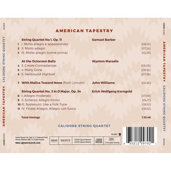 American Tapestry, par le Quatuor Calidore, tisse un vaste panorama de l'expression musicale américaine des XXe et XXIe siècles. Le programme réunit le lyrisme du Quatuor à cordes n°1 de Samuel Barber, célèbre pour son Adagio emblématique, les accents jazz de At the Octoroon Balls de Wynton Marsalis, ainsi que With Malice Toward None de John Williams, présenté ici dans sa version pour quatuor à cordes en création mondiale. L'album s'achève sur le lumineux Quatuor à cordes n°3 en ré majeur d'Erich Korngold, composé dans le Los Angeles de l'après-guerre. Ensemble, ces œuvres dessinent un continuum vibrant de la créativité américaine — un univers sonore à la fois d'une grande diversité et profondément uni par l'esprit.