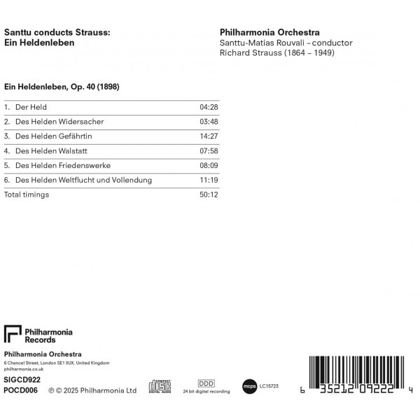 « Santtu dirige Strauss : Ein Heldenleben » est le sixième album publié par Philharmonia Records. Placée sous la direction de Santtu-Matias Rouvali, cette interprétation a été enregistrée au Royal Festival Hall du Southbank Centre.