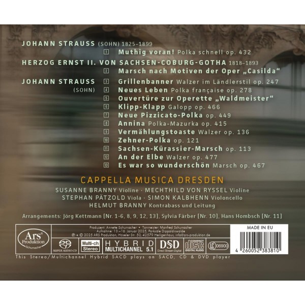 À l'occasion du 200e anniversaire de la naissance de Johann Strauss fils, célébré le 25 octobre, ce CD met en lumière les liens riches et variés entre la dynastie Strauss et l'Allemagne. À travers les villes emblématiques de Cobourg, Dresde, Hambourg et Berlin, cette production explore les échanges musicaux et culturels qui ont uni ces grandes cités à la famille Strauss. Grâce aux talentueux musiciens de la Cappella Musica Dresden, ARS PRODUKTION s'entoure ici d'interprètes de tout premier plan, garants d'une lecture aussi exigeante qu'inspirée.