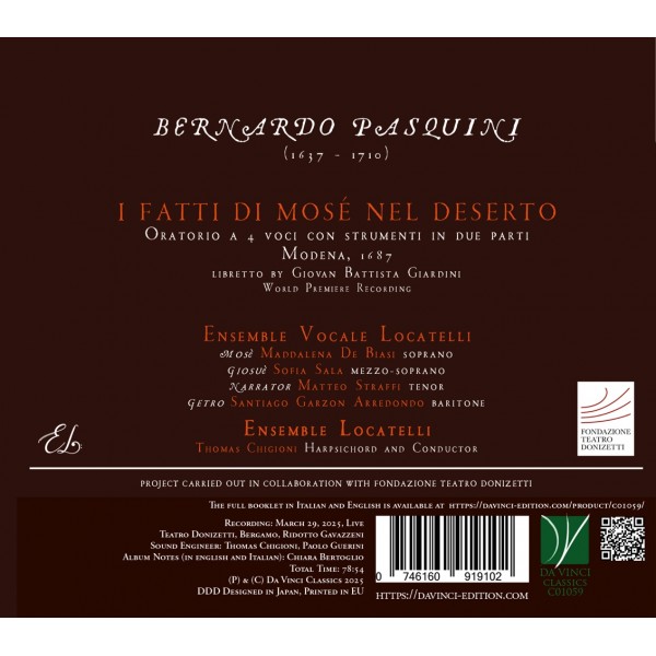 Ensemble Vocale Locatelli : Maddalena De Biasi, soprano (Mosè) / Sofia Sala, mezzo-soprano (Giosuè) / Matteo Straffi, ténor (Narrator) / Santiago Garzon Arredondo, baryton (Getro) / Ensemble Locatelli : Jérémie Chigioni violon / Ulrike Slowik, violon / Tessa Rippo, alto / Andrea Alziati, violoncelle / Carlo Sgarro, contrebasse / Mauro Pinciaroli, archiluth / Stefan Sandru, théorbe / Dimitri Betti, orgue / Thomas Chigioni, clavecin et direction