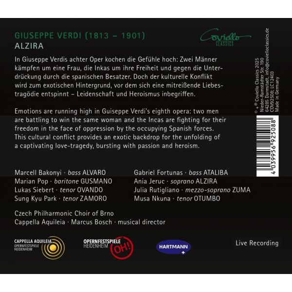 Marcell Bakonyi, basse (Alvaro) / Marian Pop, baryton (Gusmano) / Lukas Siebert, ténor (Ovando) / Sung Kyu Park, ténor (Zamoro) / Gabriel Fortunas, basse (Ataliba) / Ania Jeruc, soprano (Alzira) / Julia Rutigliano, mezzo-soprano (Zuma) / Musa Nkuna, ténor (Otumbo) / Czech Philharmonic Choir of Brno / Cappella Aquileia / Marcus Bosch, direction