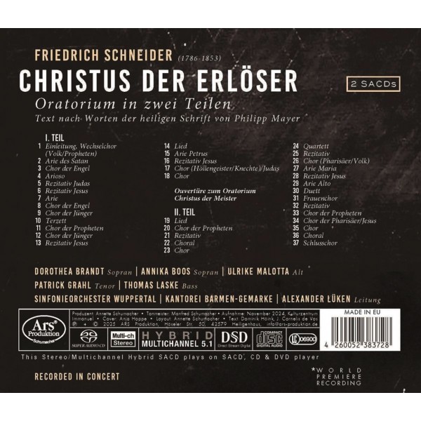 Avec Christus der Erlöser, Friedrich Schneider achève sa monumentale Trilogie du Christ. Dans les années 1820, le maître de chapelle de Dessau avait conçu le projet ambitieux de retracer la vie de Jésus à travers une série de quatre oratorios. Si ce cycle ne fut jamais entièrement mené à terme, il donna naissance à trois œuvres majeures : Christus das Kind (paru en 2022), Christus der Meister (paru en 2023) et Christus der Erlöser, consacré au récit de la Passion. Cette dernière partition témoigne du puissant sens dramatique de Schneider, de sa profonde foi religieuse et de sa maîtrise remarquable de l'écriture chorale et orchestrale.