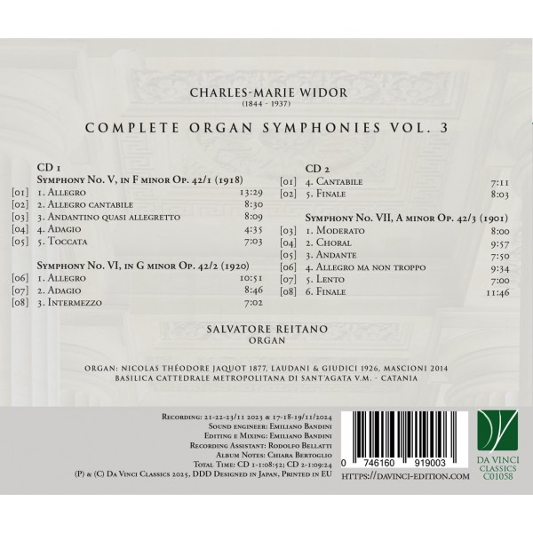 Cet album plonge l'auditeur dans l'univers sonore puissant de Charles-Marie Widor, dont les symphonies pour orgue ont révolutionné le genre. Inspiré par les instruments “symphoniques” de Cavaillé-Coll, Widor unit l'héritage de Bach aux élans romantiques. Les Symphonies n°5, 6 et 7, enregistrées ici, révèlent une virtuosité technique autant qu'une richesse expressive : timbres, formes architecturées, et moments de pure poésie. De la célèbre Toccata aux réminiscences wagnériennes, cette musique vibre d'intensité. Bien plus qu'un témoignage historique, elle incarne le dialogue vivant entre l'instrument et l'imagination. Ces interprétations veulent raviver l'élan d'émerveillement que Widor ressentait à Saint-Sulpice. Une musique faite pour une cathédrale de sons, puissante et visionnaire.