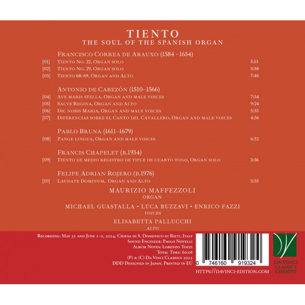 Francisco Correa de Arauxo (1584-1654) : Tiento n°22 pour orgue seul, Tiento n°29 pour orgue seul, Tientos n°68 et 69 pour orgue et alto - Antonio de Cabezón (1510-1566) : , Ave maris stella pour orgue et voix d'hommes, Salve Regina pour orgue et alto, Dic nobis Maria pour orgue et voix d'hommes, Diferencias sobre el canto del Cavallero pour orgue et voix d'hommes - Pablo Bruna (1611-1679) : Pange lingua pour orgue et voix d'hommes - Francis Chapelet (1934-*) : Tiento de medio registro de tiple de cuarto tono pour orgue seul - Felipe Adrián Rojero (1976-*) : Laudate Dominum pour orgue et alto,
