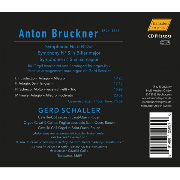 Anton Bruckner (1824-1896) : Symphonie n°5 en si Maj, arrangement pour orgue de Gerd Schaller
