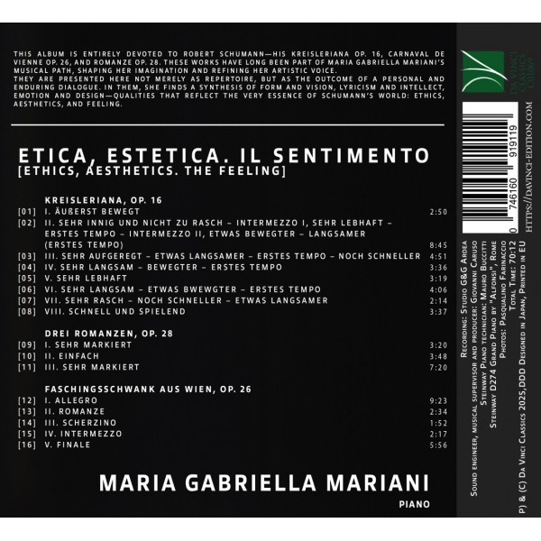 La pianiste Maria Gabriella Mariani interprète trois des plus fascinantes « suites » pour piano de Robert Schumann. Avec la Kreisleriana, l'une des œuvres les plus exigeantes du répertoire pianistique, elle explore l'univers fantasque du personnage de maître de chapelle Kreisler, imaginé par E. T. A. Hoffmann.