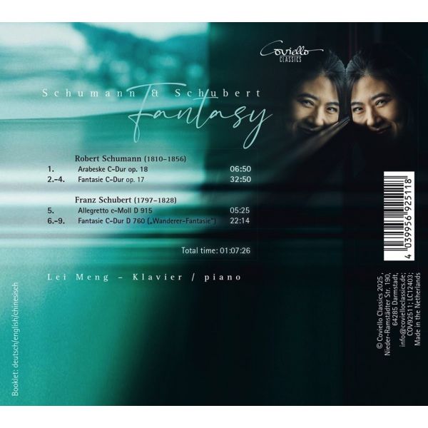 Avec des œuvres de Franz Schubert et Robert Schumann, ce CD met en lumière la pianiste chinoise Lei Meng, qui enseigne depuis 2024 en tant que professeure au Mozarteum de Salzbourg. Entièrement consacré à la magie du romantisme musical, l'album réunit deux grands maîtres de la tradition allemande : deux univers sonores distincts, portés par une profondeur émotionnelle, une imagination foisonnante et une dévotion absolue à l'art du piano.