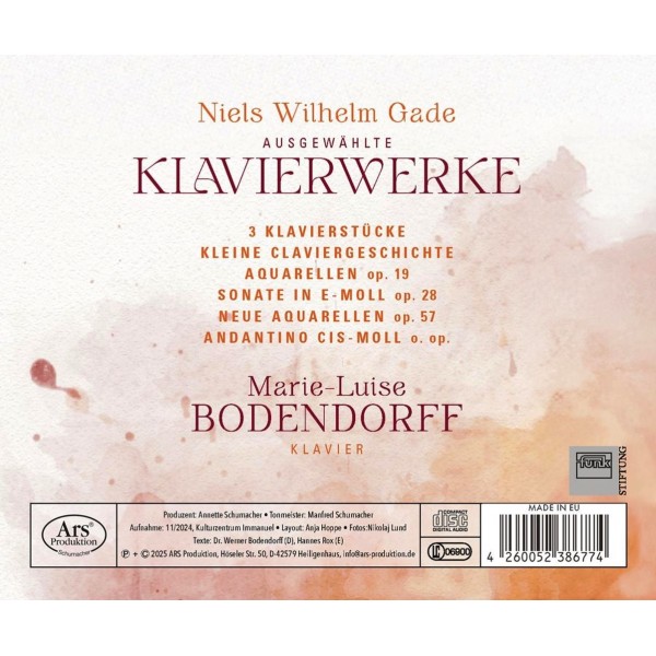 Si Niels Wilhelm Gade s'est surtout fait connaître comme compositeur de musique symphonique et concertante, son abondante production pianistique – largement publiée de son vivant – est longtemps restée dans l'ombre. Avec ce nouvel enregistrement, Marie-Luise Bodendorff met en lumière une sélection d'œuvres pour piano de Gade, révélant toute leur richesse et invitant à reconsidérer l'image que nous avons de ce compositeur.