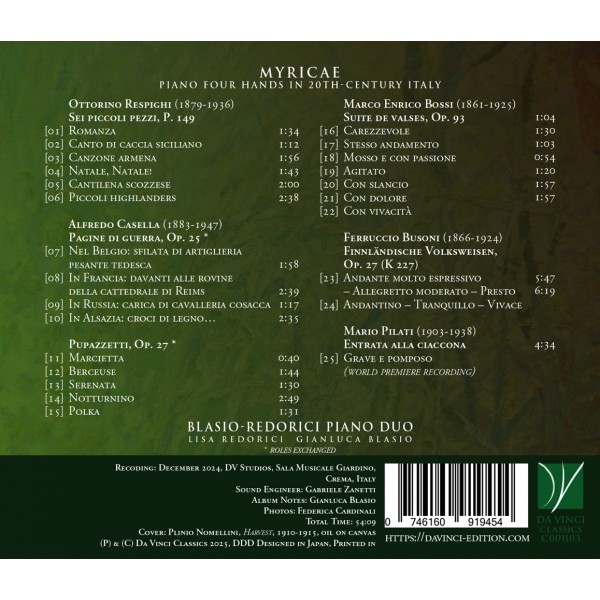 “Myricae” fait revivre l'effervescence musicale de l'Italie du début du XXᵉ siècle. De Respighi à Pilati, cette anthologie pour piano à quatre mains réunit des pièces courtes et imagées : aquarelles raffinées de Respighi, miniatures de Casella, valses rêveuses de Bossi, sans oublier une œuvre de Pilati enregistrée ici pour la première fois. Le Duo Blasio–Redorici révèle avec élégance un répertoire italien situé entre la tradition post-romantique et l'élan moderniste.