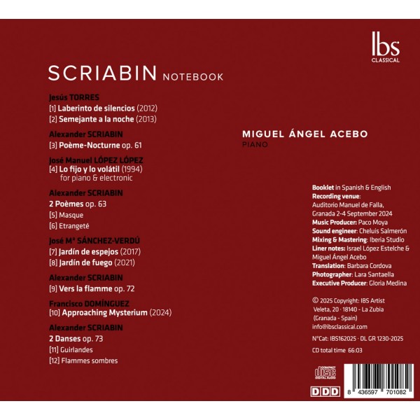 Le pianiste Miguel Ángel Acebo signe avec Scriabin Notebook (IBS Classical) un pont entre l'univers visionnaire d'Alexandre Scriabine et la création espagnole contemporaine. Enregistré à l'Auditorio Manuel de Falla de Grenade, l'album réunit des œuvres de Jesús Torres, José Manuel López López, José María Sánchez-Verdú et Francisco Domínguez aux côtés de pièces emblématiques du compositeur russe. Entre mysticisme, résonance et introspection, Acebo tisse un voyage sonore où se rejoignent quatre générations de sensibilités espagnoles autour de Scriabine, vu comme un mythe vivant : l'art comme chemin de révélation.