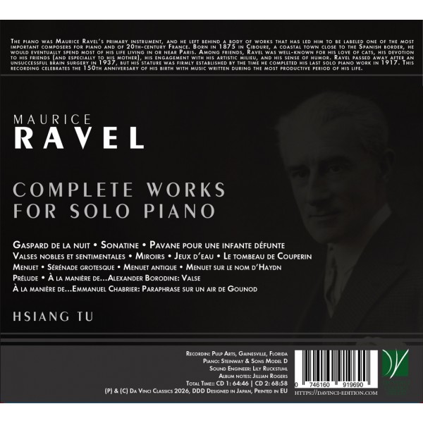 Hsiang Tu propose un portrait exhaustif de l'univers pianistique de Maurice Ravel, conçu pour le 150ᵉ anniversaire de sa naissance. Des premières expérimentations de Sérénade grotesque et Menuet antique aux architectures vertigineuses de Gaspard de la nuit et Miroirs, de l'élégance suspendue de salon de Pavane pour une infante défunte et Valses nobles et sentimentales au néoclassicisme élégant et mélancolique de Le tombeau de Couperin, ce programme retrace, presque année après année, la cristallisation de l'éthique compositionnelle de Ravel. Le piano y apparaît comme un véritable laboratoire de couleurs et un miroir intérieur, où l'eau, les cloches, les masques et les danses archaïques se transforment en emblèmes sonores d'une modernité à la fois limpide, finement ciselée et subtilement troublante.