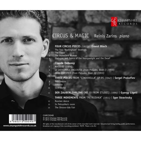 Alors professeur de composition à l'Institute of Music de Cleveland, le chef et violoniste Ernest Bloch se confie au piano qui libère sa muse moderniste. Libres ces quatre « pièces de cirque» à usage privé, rudes, enfantines, un peu Satie, un peu Clharles Ives. Si Charlie Chaplin n'a jamais répondu à la dédicace du Clown, le virtuose letton Reinis Zarins y remédie dans cet album intitulé « Circus & Magic » -entre Debussy, Stravinsky et Prokofiev. Diapason Février 2026 - Ivan A. Alexandre