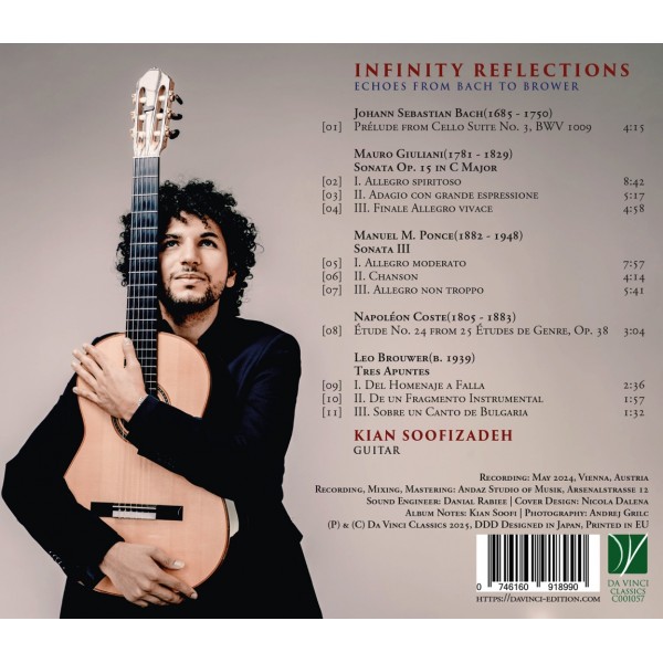 Cet album marque la première interprétation personnelle du guitariste Kian Soofi de chefs-d'œuvre du répertoire classique pour guitare : une suite pour violoncelle de Bach, des sonates de Giuliani et Ponce, ainsi que des œuvres de Coste et Brouwer. Issus d'une riche tradition, ces morceaux portent une profondeur artistique et spirituelle qui traverse les siècles. Leur exigence musicale représente un défi constant, mais aussi un voyage gratifiant. Cette interprétation met en valeur le potentiel expressif de la guitare moderne, avec une attention particulière au phrasé et à la musicalité. Chaque auditeur y trouvera un lien intime avec la musique.