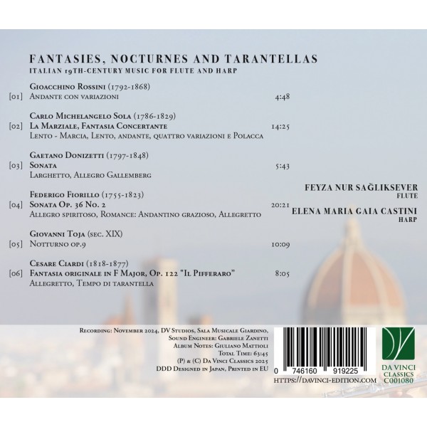 Au début du XIXᵉ siècle, chaque nouvel opéra à succès voyait naître des transcriptions et paraphrases destinées à diffuser ses airs les plus célèbres. Ces mélodies étaient adaptées en pièces de salon pour divers instruments ou petits ensembles, souvent avec flûte et harpe. Parallèlement, un répertoire original se développa pour ces deux instruments, marqué par l'élégance et l'influence du style lyrique de l'époque. Cette musique de chambre répondait au goût d'un public bourgeois avide de raffinement et de virtuosité domestique. La flûtiste Feyza Nur Sagliksever et la harpiste Elena Maria Gaia Castini nous entraînent ici dans une promenade envoûtante à travers les thèmes de Rossini, Sola, Donizetti, Fiorillo, Toja et Ciardi.