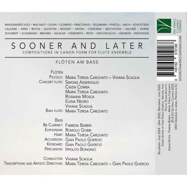Compositions en forme de canon pour ensemble de flûtes de David Manzanares Viles, Guillaume de Machaut, Guillaume Dufay, Jacob Clemens non Papa, Michael Praetorius, Georg Philipp Telemann, Henry Purcell, Johann Sebastian Bach, Hans Schoutens, Antonio Caldara, Thomas Augustine Arne, William Boyce, Paolo Agostini, Wolfgang Amadeus Mozart, Luigi Cherubini, Ludwig van Beethoven, Théodore Salomé, Louis Vierne, Franz Schubert, Robert Schumann, Johannes Brahms, Luis Miguel Aguilar / Fryderyk Chopin, Paul Hindemith, Nino Rota, Melquíades Vasconcelos, David Manzanares Viles, Rieks Veenker, Jacques Paroissien