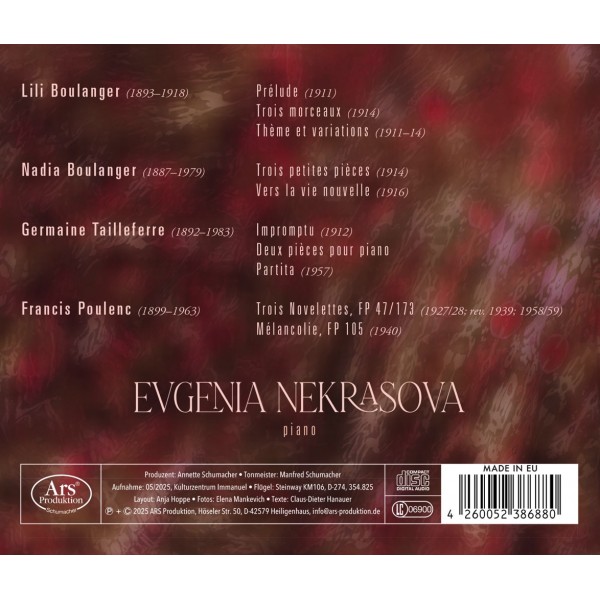 Lili Boulanger (1893-1918) : Prélude, Trois Morceaux, Thème et variations - Nadia Boulanger (1887-1979) : Trois Petites Pièces, Vers la vie Nouvelle - Germaine Tailleferre (1892-1983) : Impromptu, Deux pièces pour piano, Partita - Francis Poulenc (1899-1963) : Trois Novelettes FP 47/173, Mélancoli FP 105