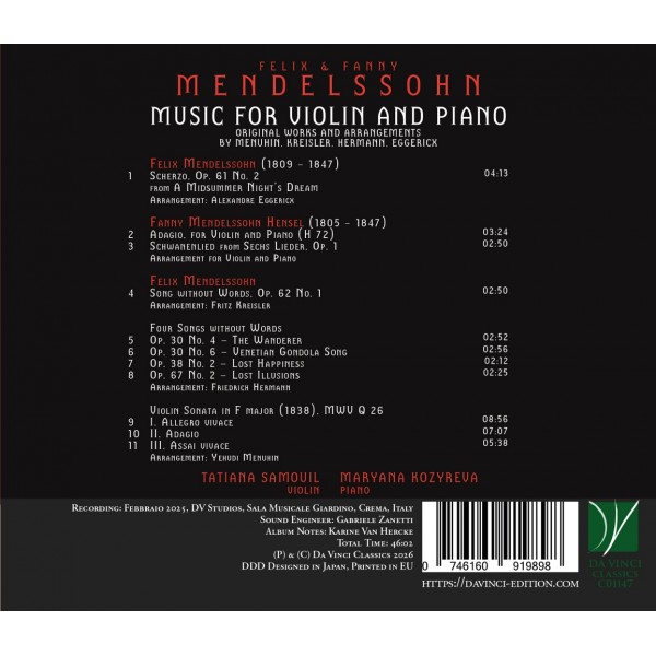 Felix Mendelssohn (1809-1847) : Scherzo Op.61 n°2 Extrait du Songe d'une nuit d'été - Arrangement: Alexandre Eggericx, Romance sans paroles Op. 62 n°1 (Song Without Words) - Arrangement : Fritz Kreisler, Quatre Romances sans paroles : Le Voyageur op. 30 n°4 (The Wanderer), Chanson de gondolier vénitien op. 30 n°6 (Venetian Gondola Song), Bonheur perdu op. 38 n°2 (Lost Happiness), Illusions perdues op. 67 n°2 (Lost Illusions) - Arrangements : Friedrich Hermann, Sonate pour violon en fa majeur MWV Q 26 - Fanny Mendelssohn Hensel (1805-1847) : Adagio pour violon et piano H 72, Schwanenlied (Chant du cygne) extrait des Sechs Lieder Op.1