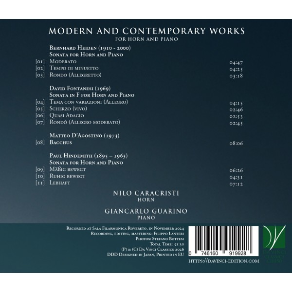 Ce enregistrement propose un parcours à travers les XXe et XXIe siècles autour d'un instrument de seuils, capable à la fois de chant et de mordant. La Sonate de Heiden, portée par une forme limpide et un thème embrassant les douze sons, ouvre sur une modernité concrète. La Sonate en fa de Fontanesi déploie un Tema con variazioni où la lumière et la densité se transforment progressivement, jusqu'à un Rondò aux ombres bleutées. Dans Bacchus de D'Agostino, conçu à l'origine pour cor et orchestre d'harmonie et présenté ici dans une version avec piano, le rituel antique se mêle au raga Todi et culmine sur un do aigu. La Sonate de Hindemith, tonale mais non diatonique, scelle le programme dans la tension entre ordre et inquiétude.